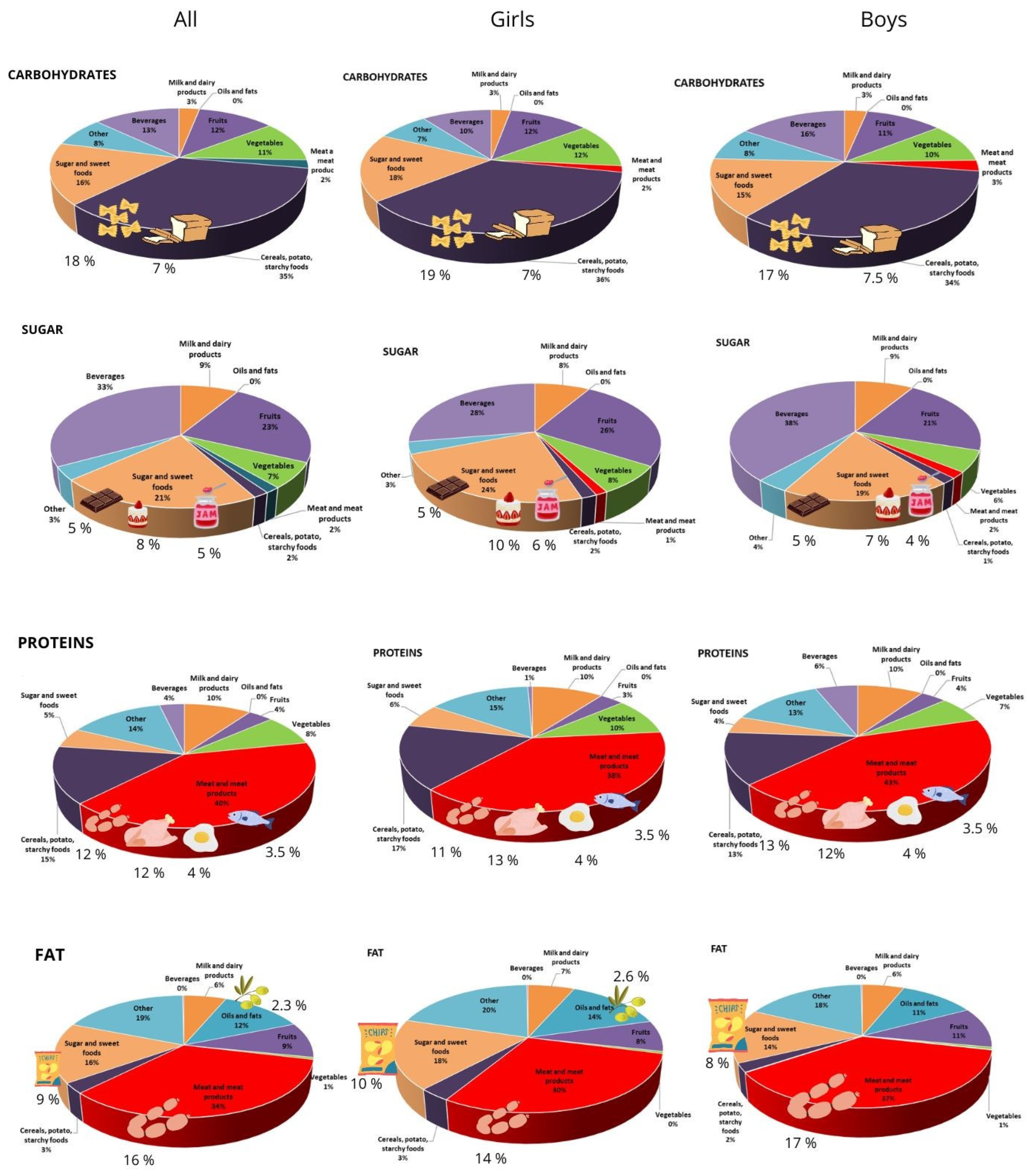 - Targeted strategies could address portion sizes for both sexes, particularly for protein-rich foods. Boys should be made aware of sugar intake from isotonic drinks and hidden fats in processed meat products. Girls should be encouraged to better understand portion sizes, improve carbohydrate quality, and choose healthier food preparation methods.