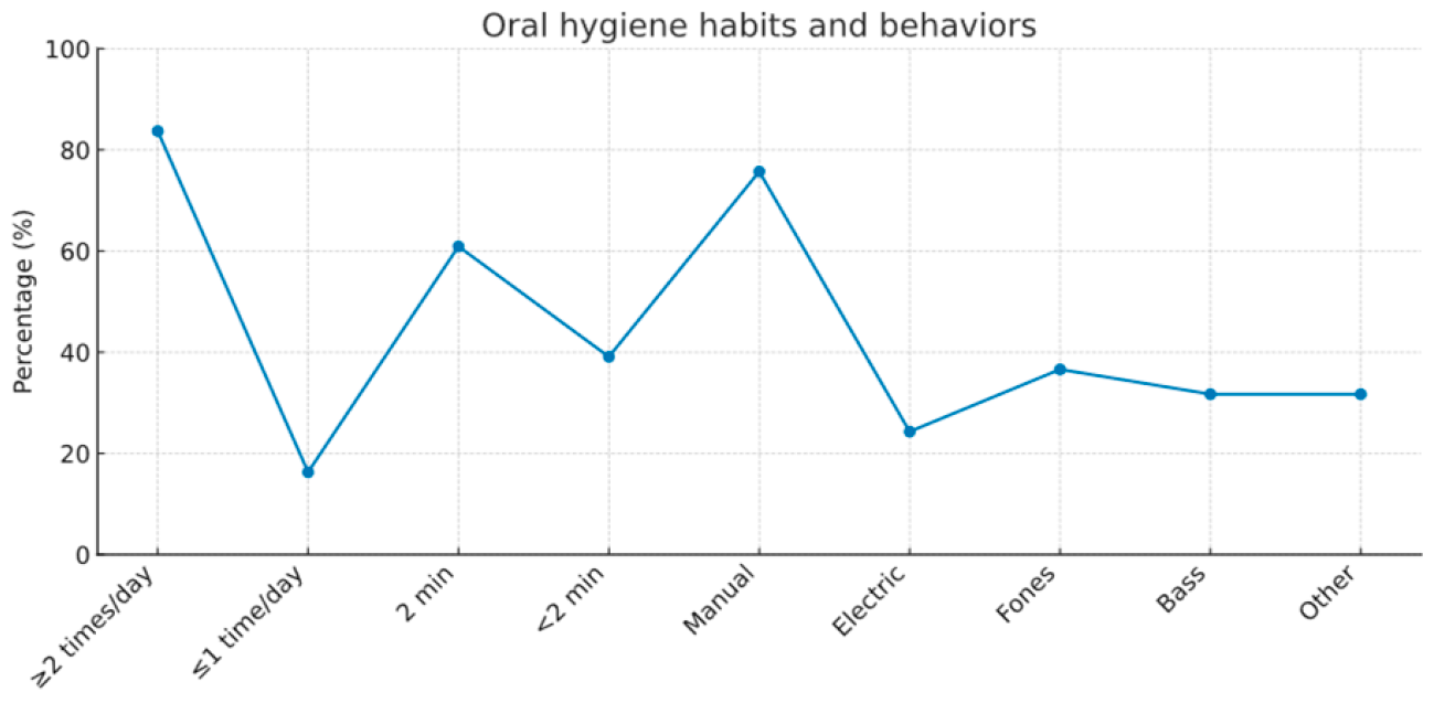 Most participants (83.7%) reported brushing their teeth at least twice daily, while 16.3% brushed once a day or less. The majority (60.9%) brushed for around two minutes, and 24.3% used an electric toothbrush (