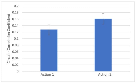 We used the 6–9 Hz alpha band to analyze mother–infant CCorr, based on previous reports and best evidence [31,32]. Analyses focused on differences in the circular correlation coefficient (CCorr) between the three actions. CCorr was calculated using the following equation: