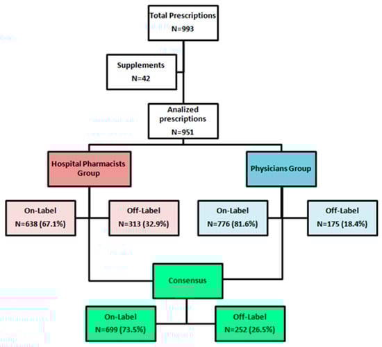 When focusing on drug prescriptions alone, a comparison of off-label uses revealed that out of 951 total drug treatments, the clinicians identified 175 (18.4%) instances of off-label use, while the pharmacists documented 313 off-label uses, representing 32.9% of all the prescriptions reviewed (p < 0.05). For a detailed overview of the review process, please refer to Figure 1.