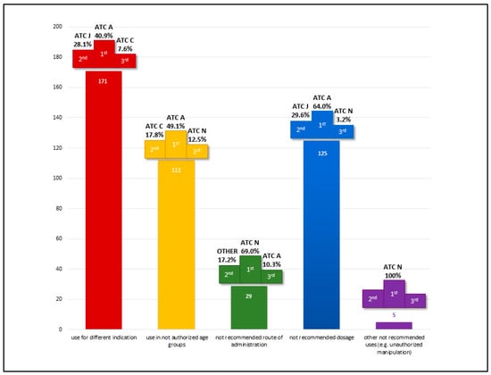 The distribution of off-label uses by the first ATC level is detailed in Figure 2, highlighting the top three most represented therapeutic classes across use categories. Class A (Alimentary Tract and Metabolism) emerged as the most represented category overall, as well as for off-label uses by indication, age, and dosage. This predominance is primarily attributable to the chronic use of proton pump inhibitors and macrogol.