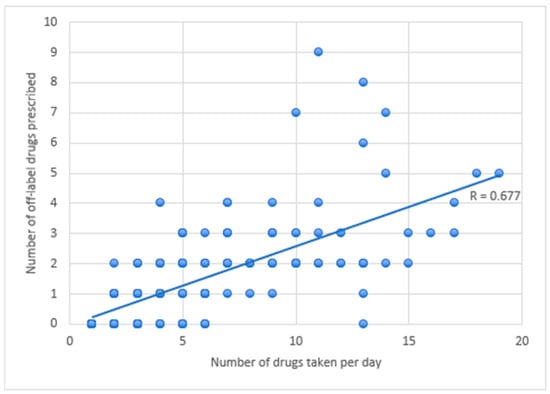 Overall, among the 89 patients in the cohort taking five or more drugs daily, the incidence rate of off-label prescriptions was 26.7%, aligning with the results from the consensus. This trend remained consistent even when focusing solely on patients with excessive polypharmacy (≥10 drugs per day), where the off-label prescription rate was 25.9%. Conversely, in patients taking fewer than five drugs per day, the percentage of off-label prescriptions decreased to 22.4%. Notably, 11 patients (12.3% of those with polypharmacy) had no off-label prescriptions; of these, only one was taking ten or more drugs per day. A correlation analysis (Figure 3) revealed a positive relationship between the number of drugs taken and the incidence of off-label prescriptions, with an R value of 0.677, which was statistically significative (p < 0.05).