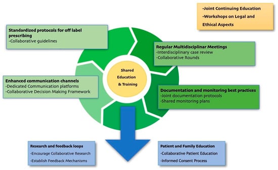 Collaboration between clinicians and pharmacists has been shown to significantly reduce the risk of medication errors related to the use of off-label drugs, but this is not systematic and is diffused in many clinical contexts [,]. The first role of pharmacists is to provide critical insights regarding appropriate doses, routes of administration, potential drug interactions, and the monitoring of side effects []. But to date there are few registries for pediatric off-label drugs or ongoing clinical trials dedicated to monitoring the use of these drugs and potentially giving more insights on the use, dosage, route of administration, safety, and effectiveness. Another important resource is the preparation of customized galenic formulations to meet the specific needs of the pediatric patient and provide correct information and training to facilitate drug delivery and solve some of these off-label indications []. The pharmacist can also play an important role in training healthcare personnel and informing patients and their families on the correct use of medicines [,,]. Continuing education and regular updates on regulations are essential for all healthcare providers involved in the use of off-label drugs in pediatrics. These programs should focus on fostering a shared understanding between physicians and pharmacists, ensuring both groups are well-informed about regulatory frameworks, evidence-based practices, and the nuances of off-label prescribing. An interdisciplinary approach is critical to enhancing patient safety and ensuring optimal treatment outcomes []. Regularly scheduled multidisciplinary meetings, collaborative audits, and joint training sessions can create a platform for open dialogue, where healthcare providers can address uncertainties, align their perspectives, and refine treatment plans together. This collaboration is particularly important in managing complex cases involving polypharmacy or fragile pediatric patients, where decisions require a balanced integration of clinical judgment and pharmacological expertise []. By strengthening interdisciplinary communication and leveraging the unique contributions of each professional, healthcare teams can ensure that off-label prescribing aligns with both clinical needs and regulatory standards. This unified approach not only promotes safer and more effective care but also fosters a culture of shared responsibility and continuous improvement in pediatric pharmacotherapy [,].
