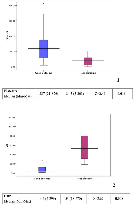 However, when comparing patients who did well (group 1) to those with a poor outcome (group 2) worse prognosis was associated with a lower platelet count (p value: 0.016), raised C-reactive protein (CRP) (p value = 0.008), higher creatinine (p value = 0.006), and higher urea (p value = 0.013).
