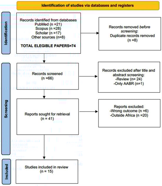 The literature search, conducted on November 2024, followed the PRISMA 2020 guidelines (the PRISMA website was visited in July 2024, see Table S1) and utilized the following 5 keywords and phrases (mesh terms): “OAE”, “neonatal hearing screening”, “congenital hearing loss”, “well babies” and “Africa”. Only research articles and review papers were considered as good candidates. The standard English language filter was not used, to identify possible information from non-English-speaking (i.e., French) scientific communities and groups. Papers related to NHS practices outside the African continent were not considered.