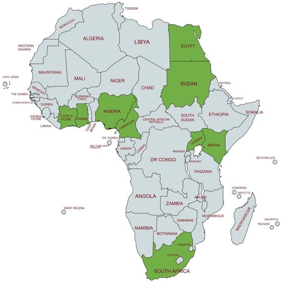 The African continent is composed by 54 countries. In various contexts, Africa is being divided into the northern part and the Sub-Saharan part, which includes 50 states. In this review, we have considered the whole continent without any specific geographical divisions. We focused our investigation on the 84.45% of the total African population (1,532,073,577 as measured in 2024 and reported in []), in terms of the first 25 population-dense African states, which are shown in Table 1.