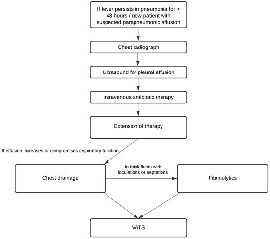 Early VATS (video-assisted thoracoscopic surgery) improves the chances of full lung expansion and adequate drainage of the pleural effusion in pediatric patients. However, its efficacy is supported by limited evidence due to the absence of large prospective studies [5,6,7,8].