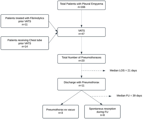 (1) Background: In children, bacterial pneumonia is the most common cause of parapneumonic pleural effusions which can eventually lead to pleural empyema. Treatment is varied and is a combination of antibiotic therapy, chest tube drainage, fibrinolytics and video-assisted thoracoscopic surgery (VATS). Postoperative complications of the latter include pneumothoraces and bronchopleural fistula (BPF). The aim of this study is to investigate the incidence and duration of pneumothoraces during the perioperative period and follow-up (FU) to elucidate their progression following video-assisted thoracoscopic surgery (VATS) to start to create an evidence-based standardized FU protocol. (2) Methods: This retrospective study included all patients who underwent VATS for pleural empyema between January 2013–May 2023 at the University Medical Center Hamburg-Eppendorf (UKE) and the Hamburg Children’s Hospital Altona (AKK). (3) Results: We identified 47 patients with pleural empyema who underwent VATS. A proportion of 43% of patients were found to have a pneumothorax with 55% of those being unresolved at discharge. At the end of FU, 27% of those had a “pneumothorax ex vacuo”. No surgical interventions were needed. (4) Conclusions: The majority of pneumothoraces after VATS in pediatric patients can be managed conservatively. In the context of follow-up care, it is recommended that X-ray examinations should be used sparingly, while sonographic follow-up examinations should be conducted more frequently. If the pneumothorax persists, further thoracoscopy for resection of the visceral pleura and treatment of bronchopleural fistula may be the next step in treatment.