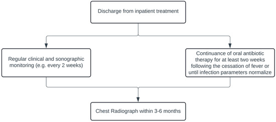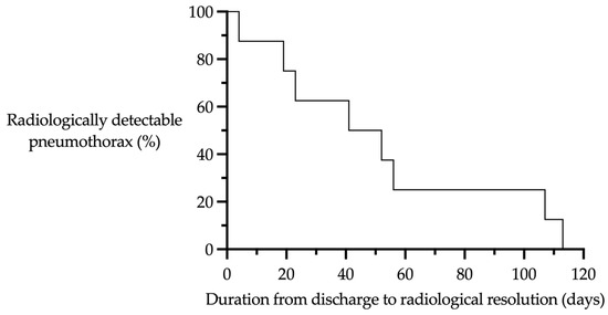Drawing upon our experience, we advocate regular clinical and primarily sonographic monitoring, at the latest every two weeks, though always adapted to the clinical situation. Oral antibiotic therapy is continued for a period of at least 2 weeks following the cessation of fever or until infection parameters normalize [4,40]. A chest X-ray is recommended within 3–6 months, although the data demonstrate that the pneumothorax was absorbed earlier on average in this cohort as the average time from discharge to “radiological resorption” of the pneumothorax was 52 days (median: 47 days) (Figure 5). Further X-ray examinations should be carried out depending on the findings. Additive measures in the outpatient setting, such as additional oxygen administration or physiotherapy, are not standard; however, there are data indicating that these measures can support the healing process [41,42] (Figure 6).