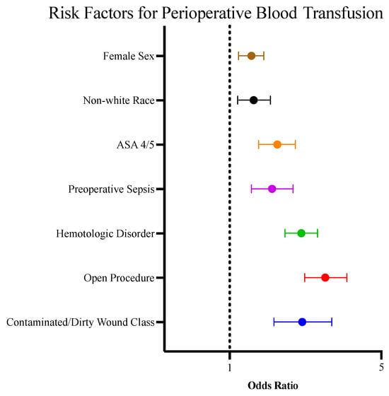 Forest plot depicting patient and operative characteristics associated with increased risk for perioperative blood transfusion. The reference categories for each risk factor above are as follows: female sex vs. male sex, non-white race vs. white race, ASA 4/5 vs. ASA 1/2/3, preoperative sepsis vs. no preoperative sepsis, hematologic disorder vs. no hematologic disorder, open procedure vs. entirely minimally invasive procedure, contaminated/dirty wound class vs. clean or clean/contaminated wound class.