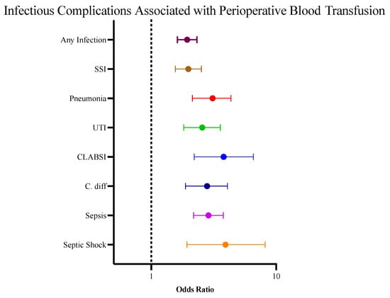 Forest plot depicting the increased risk of postoperative infectious complications associated with receipt of perioperative blood transfusions. The reference categories for each risk factor above are as follows: any infection vs. no infection, SSI vs. no SSI, pneumonia vs. no pneumonia, UTI vs. no UTI, CLABSI vs. no CLABSI, C. diff vs. no C. diff, sepsis vs. no sepsis, septic shock vs. no septic shock.