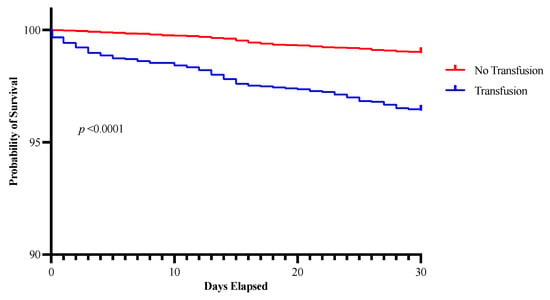 Kaplan–Meier curve depicting the association between perioperative blood transfusion and an increased risk of death in the 30 days following surgery.
