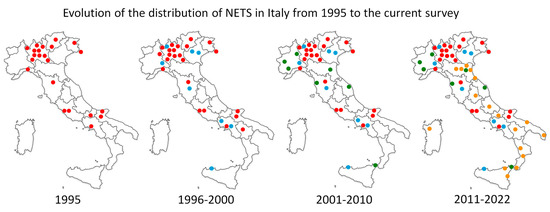 The figure shows the increase in NETSs in Italian territory starting from 1995. In the figure, the NETS operating in Turin is represented by a single dot, but in reality, it is made up of several NETSs that operate in synergy with each other. It is, therefore, a graphic trick. The different colours indicate the various NETSs that have been activated over the years, which are indicated below the map. The progression is shown in red, light blue, green, and yellow.