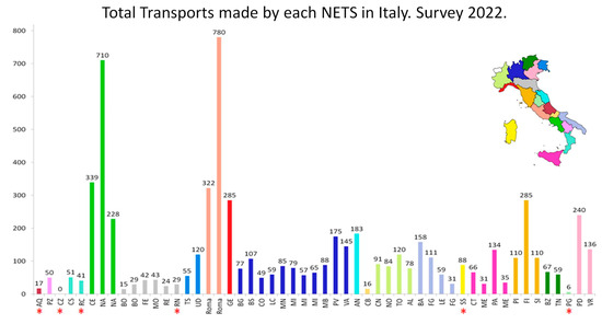 The total number of transports carried out by each individual NETS is represented. What is reported about NETS Turin in the caption of Figure 1 also applies to this figure. The asterisks refer to NETSs which have not completed a full year of activity because they were established after the start of this survey. The bars are grouped by individual regions based on colour. The small map of Italy shows the individual regions identified by the colour that corresponds to the bars in the graph. The abbreviations that appear for each single bar correspond to the official codes indicating the city that is home to the NETS. The codes correspond to those usually used in Italy, for example, for car licence plates.