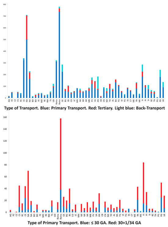 The figure shows the breakdown between the different types of transport carried out. Ga: gestational age. The colour legend of the individual bars is reported in the caption of the figures. The abbreviations that appear for each single bar correspond to the official codes indicating which city is home to the NETS. The codes correspond to those usually used in Italy, for example, for car licence plates.