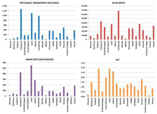 The Neonatal Transport Index (NTI) evaluates the values obtained by each region and highlights the inequalities and differences between Italian regions regarding the use of NETSs. We have previously shown [32,41] that the considered effective limit for the NTI value should be less than 1.5, which means that 1.5% of newborns require NETSs. The value considered normal for the NTI comes from evaluations carried out and published by the Italian Society of Neonatology [42]. So, if we consider that 1000 physiological pregnancies are likely to produce 1000 healthy newborns, all of whom will expected to undergo safe delivery in a first-level hospital, we must expect that 10–15 newborns may present with some complications at birth, which, although not particularly serious, may be such as to warrant transfer to a third-level hospital and, therefore, the activation of the NETS. Thus, if the regionalisation of care is effectively implemented, 1–1.5 newborns in a hundred may need NETSs. Higher values would indicate either the unwarranted overuse of NETS or ineffective regionalisation of perinatal care at a regional level, which could reasonably be expected to result in a number of inappropriate neonates being born in first-level hospitals.