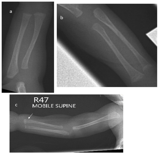 Figure 1. (a) X-ray of the right forearm in a 6-week-old infant born at 26 weeks showing changes of Grade 1 MBDP. (b) Wrist X-ray of an 8-week-old female infant born at 25 weeks showing cupping and fraying of metaphyses, Grade 2 MBDP. (c) X-ray of the right forearm in an 8-week-old infant born at 24 weeks showing a fracture at the distal end of the radius (marked by arrow). - Grade 2: changes of grade 1 plus irregularity and fraying of metaphyses, with splaying and cupping (Figure 1b)
