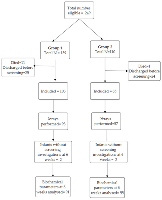 The study was conducted in the NICU at Westmead Hospital. In this retrospective study, we compared two groups of infants: Group 1 from 1 January 2016 to 31 December 2017 received PN 1 and Group 2 from 1 June 2018 to 31 May 2020 received PN 2 formulation. We included all infants born before 29 weeks’ gestation and who were admitted to our NICU within 24 h of birth. We excluded infants who were admitted beyond 24 h of age (as PN solution is not administered for outborn infants during transport), infants who were discharged or transferred to other hospitals, or who died before they could be investigated for MBDP (at 6 weeks of age). Eligible infants were identified from a prospectively maintained and verified Neonatal Intensive Care Units’ (NICUS) database. This database collates the maternal, perinatal, and neonatal clinical data of newborn infants admitted to all tertiary NICUs in New South Wales and the Australian Capital Territory. The data are collected and verified by designated audit officers following standardized definitions for clinical outcomes. Infants born between 1 January 2018 and 31 May 2018 (wash-out period) were excluded as they may have received both types of PN formulation. Additional data on laboratory biomarkers and plain radiographs were obtained from electronic medical records.