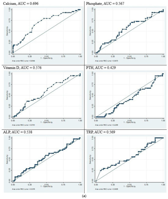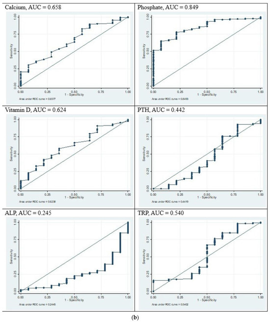 (a) ROC curves depicting correlation of biochemical tests with any grade of MBDP (grade 1/2/3). (b) ROC curves depicting correlation of biochemical tests with grade 2 or 3 MBDP.