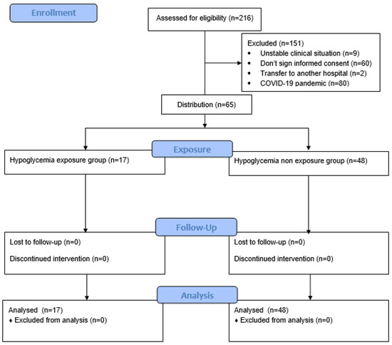 The convenience sample was divided on the basis of the blood glucose levels measured within the first 48 h of life, with an exposed group (MLPTs with glucose levels below 45 mg/dL) and an unexposed group (MLPTs with glucose levels above 45 mg/dL). According to the global recommendation, we used the blood glucose parameter of 45 mg per deciliter as the cut-off [19,25]. The treatment protocol applied for subjects with hypoglycemia was as follows. In the case of detecting hypoglycemia between 25 and 45 mg/dL, nutritional support was given using a bottle based on weight: 10–15 mL for a weight less than 2000 g, 15–20 mL for a weight between 2000 and 25,000 g, 20–25 mL for a weight between 2500 and 3500 g and 25 mL for a weight greater than 4000 g. In the case of detecting hypoglycemia less than 25 mg/dL, IV glucose was given using the following formula: 6 g/kg/day.