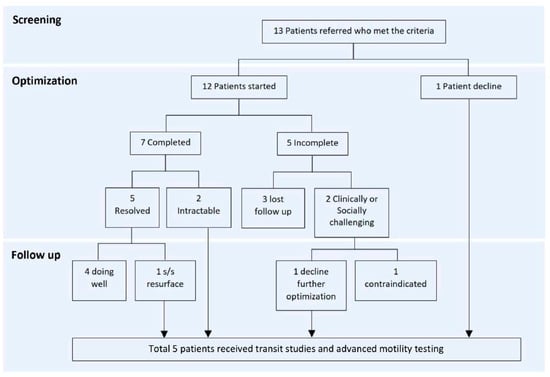 Referred patients were encouraged to complete a treatment optimization and evaluation process following the facility’s pathway, as illustrated in Supplemental Figures S1 and S2. Medically refractory bowel dysfunction was defined as the failure to respond to optimized conventional therapy (routine use of maximum doses of oral or enteral stimulants combined with one or more other pharmacologic therapies) for at least eight weeks. Those who failed to respond underwent more advanced testing, including colonic transit time (CTT), anorectal manometry (ARM), and/or colonic manometry (CM). Data on surgical procedures performed following testing, if applicable, were also collected.