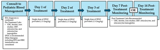 Intravenous sodium ferric gluconate complex (SFGC), along with other newer carbohydrate iron formulations have been demonstrated to be effective in improving iron deficiency with a low rate of severe adverse drug reactions and barriers to treatment [18,19]. Helen DeVos Children’s Hospital (HDVCH) is a large tertiary center in Michigan that commonly utilizes SFGC. A standardized clinical workflow for hospitalized pediatric patients with iron deficiency anemia at this institution involves an initial consultation under the Pediatric Blood Management Program (PBMP). Figure 1 demonstrates the timeline for a patient with confirmed iron deficiency anemia involved in this experience. The standard of care at this institution is administration of an SFGC 1.5–2 mg/kg dose once daily for three consecutive days, with monitoring serum laboratory recommendations provided for either 7 days post-treatment or 14 days post-treatment. Prior work at our institution has shown both safety and success in the rapid correction of iron deficiency anemia utilizing this dosing protocol. Further explanation of the PBMP and dosing regimen of SFGC was elucidated by previously published work done at this institution by Hassan et al. [20].
