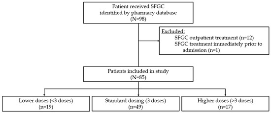 Quantitative data were expressed as mean ± standard deviation or median [25th, 75th percentile], depending on normality. Normality was assessed by looking at a histogram, using a Shapiro–Wilk p-value and reviewing the skewness and kurtosis of the data points. Categorical data were expressed as count (%). Patient outcomes and characteristics were described with the exposure variable of SFGC as a categorical variable. Descriptive hematologic values were presented as a whole sample, not considering a categorical or continuous variable. Quantitative descriptors and outcomes were compared between three dose groups using Kruskal–Wallis tests, as none of the variables met normality assumptions. Categorical descriptors and outcomes were compared between three dose groups using Chi-square, or if more than 20% of the expected cell counts were less than five, a Fisher’s exact test was used. Additionally, the exposure variable of SFGC was utilized as a continuous variable using Pearson’s correlation coefficient to detect correlations amongst various dependent variables. All statistical significance was assessed at p < 0.05. All statistical analyses for this project were completed using SAS Enterprise Guide Software, Version 7.1, SAS Institute Inc., Cary, NC, USA.