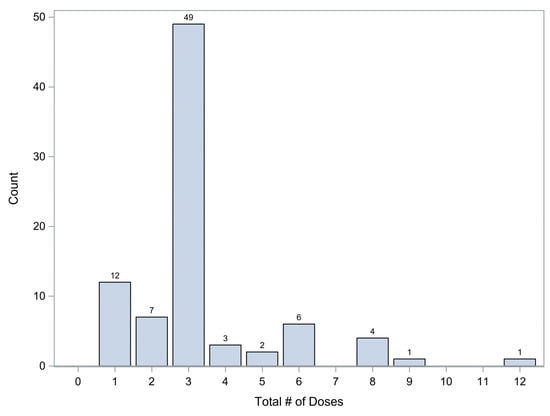 The majority of patients, 49 (57.6%), received three doses of SFGC given once daily for three consecutive days in accordance with the current dosing protocol at HDVCH. While 19 (22.3%) received less than three doses and 17 (20%) received greater than three doses. All patients received SFGC doses of 1.5–2 mg/kg. The patients who received less than our institutional standard of a three-dose series of SFGC either did not have PBMP involvement or did have the recommendation for a three-dose series from PBMP, however changes in their care such as discharge from the hospital resulted in not completing the series. The patients who received more than three doses had complex and evolving clinical situations that led to perceived need for repeated series, usually based on repeated low iron indices in the face of continued anemia or subacute blood loss. Figure 3 demonstrates the frequency distribution of dosing in our study population.