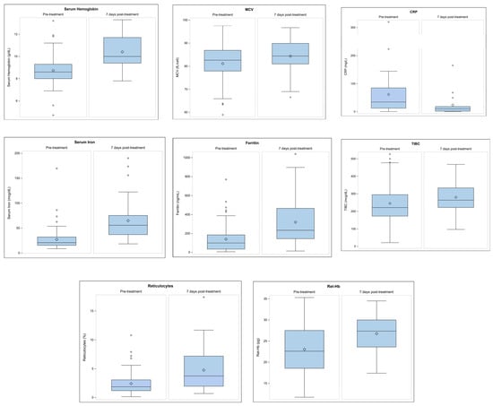 Pre-treatment versus 7 days post-treatment hematologic laboratory values for cumulative dose of SFGC received. This figure demonstrates the change in hematologic outcome variables from pre-treatment to 7 days post-treatment based on cumulative dose of sodium ferric gluconate complex received. Data from 14 days post-treatment were excluded due to high burden of missing data points and statistical insignificance. SFGC: sodium ferric gluconate complex, MCV: mean corpuscular volume, TIBC: total iron binding capacity, CRP: c-reactive protein. ° Circles in the boxplots represent outliers. An outlier is described as an observation that is at least 1.5 times the interquartile range (IQR) less than quartile 1 or at least 1.5 times the IQR more than quartile 3.