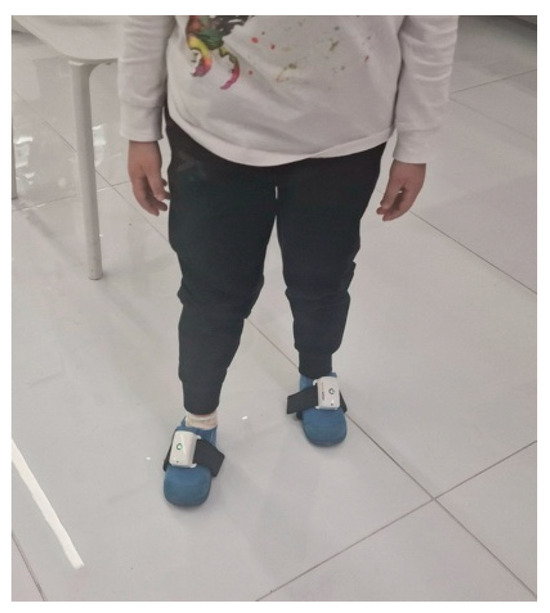 In the evaluation of gait parameters and the analysis of the gait cycle, PABLO® Lower Extremity (Tyromotion, Graz, Austria) [16] was used. PABLO® Lower Extremity is an inertial measurement unit (IMU)-based gait analysis system. Wearable IMUs have the potential to enable accurate gait assessment with different pathological gait patterns. Lightweight, wirelessly portable, it does not restrict movements of the legs and the patient’s gait (Figure 1). The monitored parameters of the gate are speed (m/s), frequency (steps/min) and length of double step (cm). The analysis of the gate cycle is performed by determining the duration of the gait phases (support phase and swing phase) and is expressed in % duration during one step.