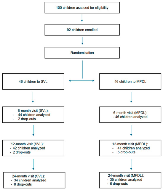 The baseline and one-year results of this study have already been published by Sánchez-Tena et al. [29]. Initially, 92 children were recruited and randomly assigned to two groups: the SVL and MPDL groups were the control and treatment, respectively. During the first year, nine participants dropped out (five from the MPDL cohort and four from the SVL cohort), leading to an attrition rate of approximately 10%. The analysis included 83 children (42 with SVL and 41 with MPDL). In the second year, an additional 14 children left the study (6 from the MPDL cohort and 8 from the SVL cohort). Factors contributing to withdrawal included starting a new treatment after the 12-month study (six children from each group), relocating (one child from the control group), and missing follow-up visits (one child from the control group) (Table 2). Ultimately, 69 children completed the two-year follow-up (35 with MPDL and 34 with SVL), with a mean age of 10.0 ± 1.8 years (ranging from 6 to 12 years). Power analysis determined that a sample size of 34 participants per group would provide 80% power, based on a one-sided test with a 5% Type I error threshold. This calculation assumes a mean difference between groups of 0.14 mm with a standard deviation (SD) of 0.23 mm. The flowchart of the RCT is shown in Figure 1, and the baseline demographic and clinical characteristics of the participants are presented in Table 3.