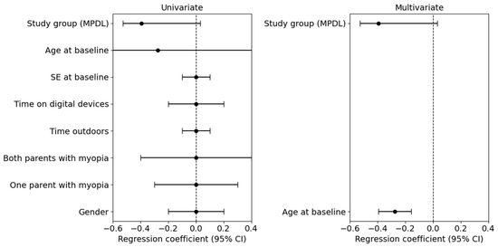 Regarding the factors linked to relative AL growth, univariate linear regression analyses revealed that associations with variables such as gender, parental myopia, outdoor time, hours spent using digital devices, and the initial spherical equivalent had no significant impact on the relative AL growth between the baseline and 24 months. However, the age of the child at enrollment affected the proportional increase in axial length during both periods (regression coefficient for baseline to 24 months: −0.275, 95% CI: −2.232 to 1.681). The negative regression coefficient (−0.275) indicates that for each additional year of age at the start of the study, the relative AL growth was lower. This suggests that AL increases more in younger children, which could imply that myopia progression is faster in this group. As such, the efficacy of the MPDL lens in controlling AL growth may be greater in younger children, who experience a faster progression rate. The regression coefficient was −0.275, with a 95% CI of −0.393 to −0.158 for the period between the baseline and 24 months (Figure 3).