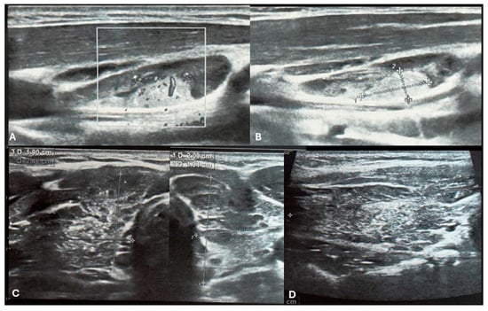 Ultrasound imaging of the thyroid and neck region. (A,B) Ultrasound images depict a vascularized hyperechoic lesion measuring 1.01 × 0.45 cm located within a lymph node in the cervical level III. This finding raises suspicion for malignancy due to pathological vascularization and its proximity to the right thyroid lobe. (C) Transversal images of right and left lobe showing remodeled thyroid gland as a result of autoimmune thyroiditis. (D) Longitudinal image of the right lobe. The thyroid parenchyma demonstrates characteristic heterogeneity, consistent with the chronic inflammatory changes seen in AIT. Additionally, multiple small microcalcifications are visible throughout the right thyroid lobe (C,D).