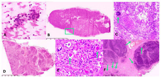 Morphologic findings. (A) Slide presenting cytological result from FNAB of the right thyroid lobe; (B)—intraoperative examination revealing lymph node metastasis; (C) Enlarged part of B containing psammoma body [green arrow] in metastasis; (D) Autoimmune thyroiditis’s-related changes seen in the left lobe of the thyroid gland; (E) Microfoci of carcinoma cells in the right thyroid lobe; (F) Fibrotic area with psammoma bodies in thyroid gland [down left], lymph node without metastasis [right], and parathyroid fat tissue [over the vessel].