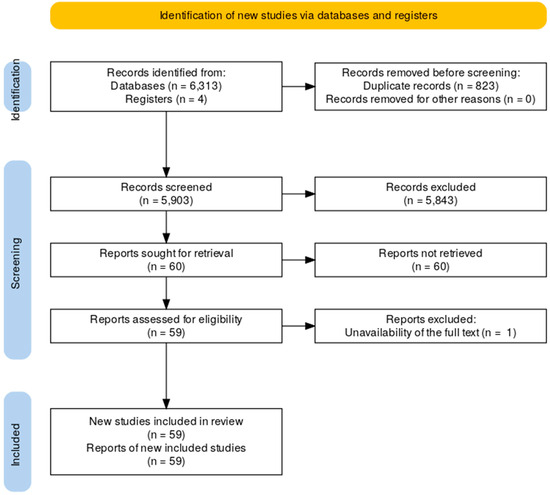 The initial search identified 6313 articles. After removing 823 duplicates, 5490 articles remained for title and abstract screening. Two authors (R.N. and F.L.) independently screened these records to ensure consistency in the inclusion process. Disagreements were resolved through consensus discussions. A total of 60 articles were selected for full-text evaluation, of which 1 was excluded due to unavailability of the full text. The final review included 59 studies. A flow diagram illustrating the selection process was constructed to provide a transparent overview (Figure 1).