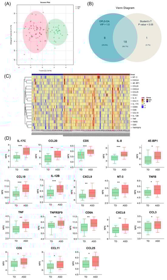 Differentially expressed inflammation-related proteins in ASD and TD groups. (A) Score plot of the orthogonal partial least squares regressions discriminant analysis (OPLS-DA) model delineating the separation of autism spectrum disorder (ASD) and typical development (TD) groups based on protein expressions (NPX). (B) Venn diagram showing proteins with a Variable Importance in Projection (VIP) score > 1.0 (calculated via OPLS-DA) and p-value < 0.05 (calculated via Student’s t-test). (C) Heat maps of 18 differentially expressed proteins (DEPs). (D) Box plots of these 18 DEPs. (* p < 0.05, ** p < 0.01, *** p < 0.001).