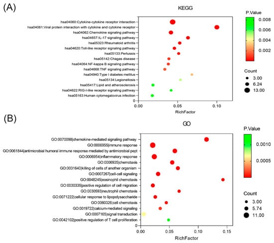 To further investigate the potential function of the DEPs, we performed GO and KEGG enrichment analyses. On a background of all annotated proteins, several pathways were involved, such as the cytokine–cytokine receptor interaction, IL-17 signaling pathway, toll-like receptor (TLR) signaling pathway, and nuclear factor-κB (NF-κB) signaling pathway, consistent with previous studies [10,29] (Figure 2A). Additionally, GO enrichment analysis revealed that the DEPs were primarily associated with chemokine-mediated signaling, immune responses, and inflammatory processes (Figure 2B).
