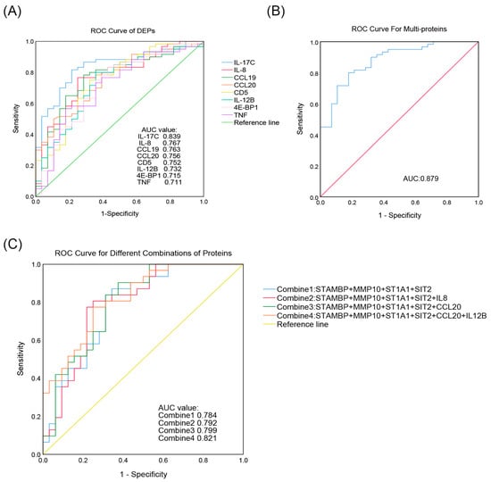ROC curves for the 18 DEPs were plotted based on sensitivity and specificity, and the AUCs were individually computed. This showed that 8 of 18 DEPs had an AUC of > 0.7 (95% confidence interval [95%CI]) and were of potential diagnostic significance (Figure 3A). These were IL-17C (0.839 [0.754–0.924]), IL-8 (0.767 [0.662–0.872]), CCL19 (0.763 [0.655–0.871]), CCL20 (0.756 [0.652–0.859]), cluster of differentiation (CD) 5 (0.752 [0.642–0.863]), IL-12B (0.732 [0.618–0.846]), eukaryotic translation initiation factor 4E-binding protein 1 (4E-BP1) (0.715 [0.5955–0.836]), and TNF (0.711 [0.592–0.831]). Of these, IL-17C had the highest AUC value and was deemed a better diagnostic classifier than the other seven DEPs. A logistic regression model was calculated for the ROC curves of these eight DEPs. A classifier composed of these DEPs was higher than a single IL-17C, with an increase in AUC from 0.839 (0.754–0.924) to 0.879 (0.805–0.902) (Figure 3B). The AUC values for all DEPs are provided in Table S3.