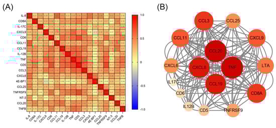 Considering the likelihood of a cascade of inflammation, we conducted a correlation analysis between the 18 inflammatory proteins (Figure 4A). Unsurprisingly, we found many associations between inflammatory proteins, among which CD5 and TNF were most significantly positively correlated (r = 0.739, p < 0.01). To explore interactions between the 18 DEPs, we annotated them using the STRING database and mapped the PPI network using Cytoscape. This showed that TNF, CCL20, CXCL8, and CCL19 had higher degree scores in the PPI network, suggesting they may play an important role in ASD (Figure 4B).