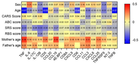 Subsequently, we examined the correlation between the 18 DEPs and the clinical characteristics of children with ASD. This showed that IL-17C, CCL19, IL-12B, IL-13, TNF, and CD5 levels were negatively correlated with SRS scores in children with ASD, while CD6 and CCL20 were associated with social awareness from SRS, and tumor necrosis factor β (TNFB) was associated with autistic mannerisms from SRS. Furthermore, IL-12B was associated with RBS-R scores in children with ASD, while CCL20 and TNF were associated with self-injurious and sameness from RBS-R, respectively (Figure 5). Finally, CCL19, TNF, CD5, and CCL3 were positively correlated with maternal age but were independent of the father’s age. The results of the complete Spearman correlation analyses are provided in Table S4.