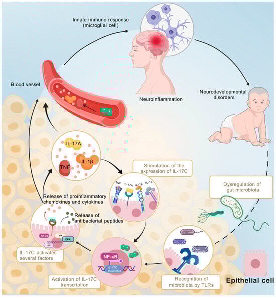 The potential mechanism linking IL-17C in the pathogenesis of ASD. Gut microbiomes play a vital role in human health. During intestinal gut dysbacteriosis, harmful bacteria are increased and recognized by TLRs on the surface of colon epithelial cells. This increases the expression of IL-17C through the NF-κB pathway. At the same time, IL-17C interacts with IL-17RE to release pro-inflammatory chemokines and cytokines, such as TNF, IL-1β, and IL-17A, thereby activating multiple pathways. These products further stimulate IL-17C expression. Eventually, IL-17C and pro-inflammatory chemokines and cytokines enter the brain through blood circulation, activating the innate immune response of microglia. This can ultimately affect the neurological development of children, resulting in the occurrence of ASD. The figure was created with BioGDP.com [47].