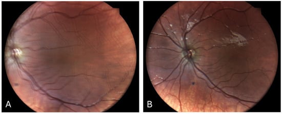 Repeated fundus photographs (Figure 3A,B) revealed double images with small-to-medium amplitude and both horizontal and vertical components in both eyes, consistent with clinical findings. The macula was normal. Blinded grading of the photographs yielded scores of 2 for the right eye and 3 for the left eye.