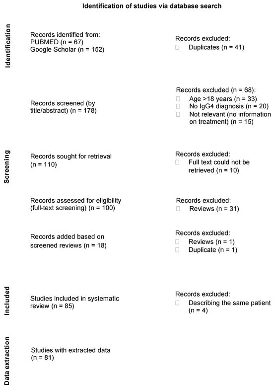 - Patel, U.; Saxena, A.; Patel, D.; Ayesha, I.E.; Monson, N.R.; Klair, N.; Yu, A.K. Therapeutic uses of rituximab and clinical features in immunoglobulin G4-related disease: A systematic review. Cureus 2023, 15, e45044. [Google Scholar] [CrossRef] [PubMed]