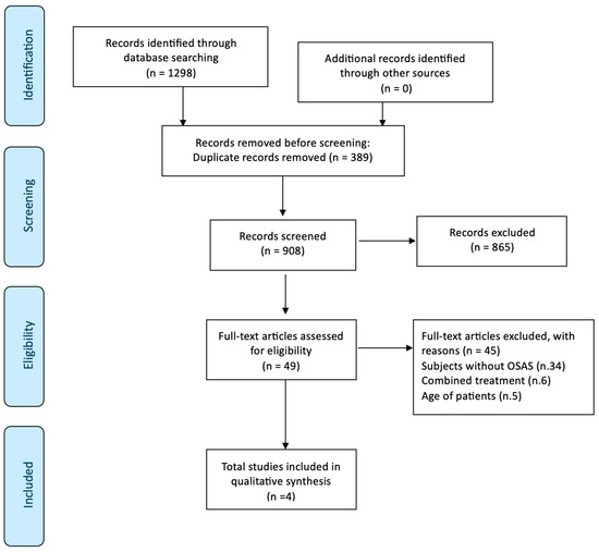 The search revealed 1298 total results. After removing the duplicates and checking for the presence of keywords in the title and abstract, a total of 49 articles were selected for full-text reading. Further screening excluded 45 articles for the following reasons: subjects without OSA (34), combined treatments, those that use FAs combined with other therapy (6), and the age of patients (4). Four articles were included for data extraction (Table 2). Overall, 191 patients were involved in the included studies, with a mean age of 9.6 years. In particular, excluding the study by Zreqat [24], the percentage of males is equal to 59% (mean age 10.5) and the percentage of females is equal to 41% (mean age 10.7). Regarding the study population, Zreqat [24] evaluated a homogeneous sample both in terms of the number of tests and controls as well as the mean age. Pavoni [25] used a control group with a larger number compared to the tests (51/31), while the mean age remained homogeneous. It can be stated that this is the same as the study by Maspero [9], which presents a number of tests quadruple to that of the controls. A significant difference between the number of controls and tests may lead to a reduced validity of the obtained results.