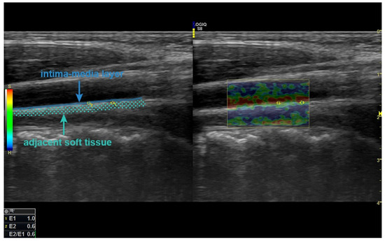 In SE examination, ROIs placed at the same depth in the intima–media layer and adjacent soft tissue on the posterior wall, 2 cm distal from the level of the left CCA bulb, are seen. SE: strain elastography, ROI: region of interest, CCA: common carotid artery.