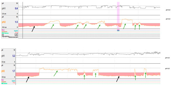 p = 0.016). This correlation was not observed with the duration of gastric pH < 4.0. Since this correlation was observed during non-meal periods and with non-acidic gastric pH, these findings may suggest either a DGR or delayed gastric emptying, though the brief spike patterns of non-acidic gastric pH (