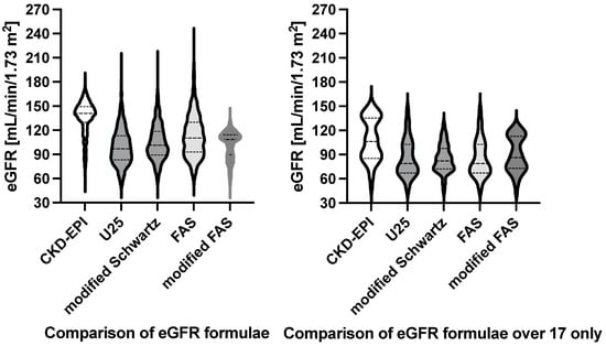 Violin plot of the four GFR estimates. This figure has two panels. The left panel regards the entire patient group, and the right panel is for patients over 18 only. CKD-EPI—Inker’s eGFR formula for adults []; U25—Pierce’s CKiD eGFR for patients aged 2–25 years of age []; modified Schwartz—Schwartz’ updated formula of the bedside eGFR for enzymatic creatinine measurements []; FAS—Pottel’s full age spectrum []; modified FAS—modified Pottel’s full age spectrum [].