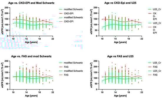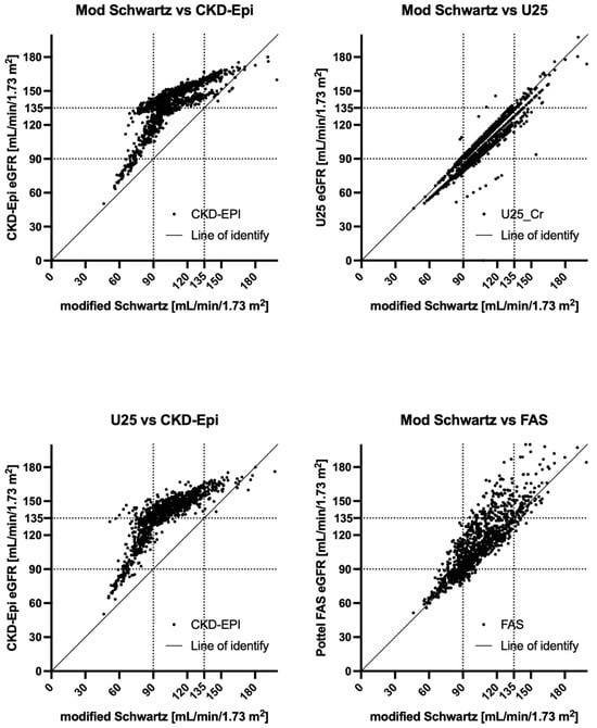 It is also essential to correctly identify patients with hyperfiltration, as they may also be at risk []. The CKD-EPI and the modified Schwartz formula identified the same participants; however, U25, which included a dataset with very few hyperfiltration participants, identified a significantly lower number. Unfortunately, hyperfiltration influences serum creatinine, whereas the impact on cystatin C is much less [].