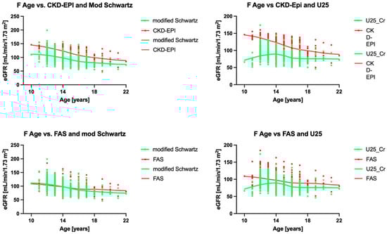 - Filler, G.; Ahmad, F.; Bhayana, V.; Díaz Gonzáles de Ferris, M.; Sharma, A.P. Limitations of U25 CKiD and CKD-EPI eGFR formulae in patients 2–20 years of age with measured GFR>60 mL/min/1.73 m2—A cross-sectional study. Pediatr. Nephrol. 2024, 39, 1169–1176. [Google Scholar] [CrossRef]