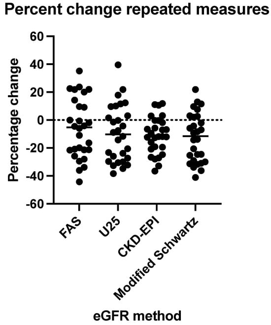 We investigated if this difference among the various eGFR formulae improved with age. Twenty-eight participants had two consecutive measurements with a median of 2 years (IQR 2,2). FAS eGFR dropped on average by −6.03 ± 21.46%, U25 by −9.64 ± 20.36%, CKD-EPI by −11.1 ± 13.12% and modified Schwartz by −12.61 ± 17.50% (Figure 5). Using Geisser–Greenhouse correction for ANOVA, the matching was effective (Chi-square 115.5, df 1, p < 0.0001), and the percentage drop was statistically significant (p = 0.0206, Geisser–Greenhouse epsilon 0.6750). As such, all five eGFR models behaved similarly.
